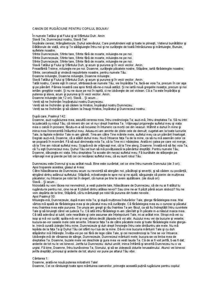Tineti post in zilele de luni, miercuri si vineri si in posturile de peste an. Întru dreptatea ta scoate din necaz sufletul meu. 26/09/2010 · canon de rugăciune pentru copilul bolnav. Trebuie sa va rugati neincetat si sa tineti post pentru sanatatea copiilor vostri. Alungă de la el toată boala şi toată neputinţa. Tineti post in zilele de luni, miercuri si vineri si in posturile de peste an. Tu, care eşti doctor al sufletelor şi al trupurilor, arată şi acum puterea milostivirii tale. 31/07/2012 · rugaciune pentru copilul bolnav. Tu, care eşti doctor al sufletelor şi al trupurilor, arată şi acum puterea milostivirii tale. Rugaciunea se citeste in fiecare zi. Tu, care eşti doctor al sufletelor şi al trupurilor, arată şi acum puterea milostivirii tale.