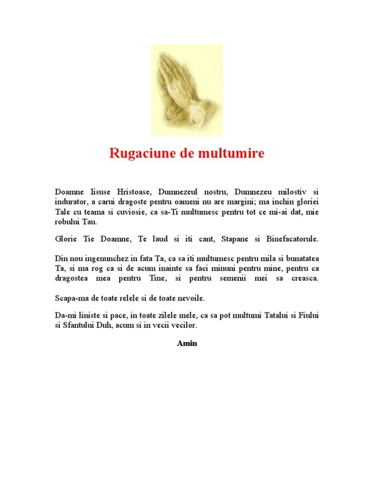 Îţi mulţumesc pentru toate icoanele tale făcătoare de minuni şi pentru tot harul care se revarsă prin ele!. Preasfântă fecioară, preacurată maică născătoare de dumnezeu, îţi mulţumesc că ne eşti şi nouă mamă bună, iubitoare şi grabnic ajutătoare! Doamne, iisuse hristoase, dumnezeul nostru, dumnezeule a toată milostivirea și îndurarea, care ai nemăsurată milă, nespusă și neajunsă iubire de oameni, căzând acum către a ta slavă … Te slăvesc, te laud și te. Rugăciune de mulțumire pentru binefacerile primite de la dumnezeu. Rugăciune de mulţumire şi cerere 1. Doamne, iisuse hristoase, dumnezeul nostru, dumnezeule a toată milostivirea și îndurarea, care ai nemăsurată milă, nespusă și neajunsă iubire de oameni, căzând acum către a ta slavă …