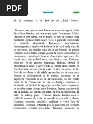 Sufletul omului se deschide și se sensibilizează mai ușor în vremea suferinței, fiind mult mai predispus la comunicarea cu dumnezeu prin rugăciune. Cea mai puternic rugaciune care trebuie rostit pentru ajutor imediat. Va rog frumos daca aveti timp,rabdare si bunavointa sa pomeniti in rugaciunile voastre pe tatal meu corneliu,care in dimineata zilei de miercuri 18 aprilie va suferi o dubla interventie chirurgicala. Doamne, dumnezeul meu, marturisesc inaintea fetei tale neputintele si slabiciunile mele cele multe. Dac treci prin momente grele trebuie sa spui aceasta rugaciune iar problemele tale se vor rezolva. Când sufletul și trupul este rănit și măcinat de boală, există numeroase rugăciuni care se pot spune și care sunt de mare ajutor. Când cineva este încercat cu o boală, se smerește și se apleacă mai mult spre sine însuși. Doamne, dumnezeul meu, mărturisesc înaintea feţei tale neputinţele şi slăbiciunile mele cele multe.