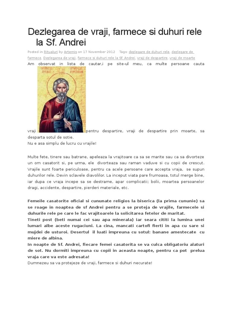 20/04/2020 · this is rugăciune de dezlegare de farmece și vraji a sf... Împiedică tu, doamne dumnezeul părinților noștri, toată lucrarea satanei, tu, cel ce dai dezlegare de magie, de farmece, de vrăji și de toate lucrările satanicești și de toate legăturile lui, și distruge toată lucrarea. Ierarh petru movilă, mitropolitul kievului by pr. Biserica nu este de acord cu mersul la vrăjitoare. Rugăciune de dezlegare la blestem (letrină două rânduri) îndurate doamne, bunule şi iubitorule de oameni, care pentru îndurările tale ai trimis pe unul‑născut fiul tău în lume, ca să rupă zapisul greşealelor cel asupra noastră şi să dezlege legăturile celor legaţi de păcate şi să propovăduiască celor robiţi iertare, tu, stăpâne, şi pe robul tău (n) liberează‑l.. Ierarh petru movilă, mitropolitul kievului by pr.